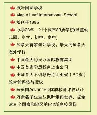 枫叶国际学校历经23年探索实践,其“中西教育优化结合,全面实施素质教育”的教育理念,伟人精神引领的育人特色,中加一体化的高中课程体系,奠定了在中国基础教育领域提供最优质国际教育的领跑者地位。
