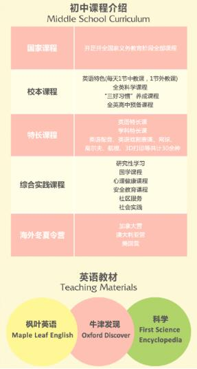 注重学生的养成教育,实施“三好”育人模式。开设国内九年义务教育初中阶段的全部课程,并引进了加拿大初中科学课程。部分学科根据学生的学业基础和学习能力制订个性化课程方案。