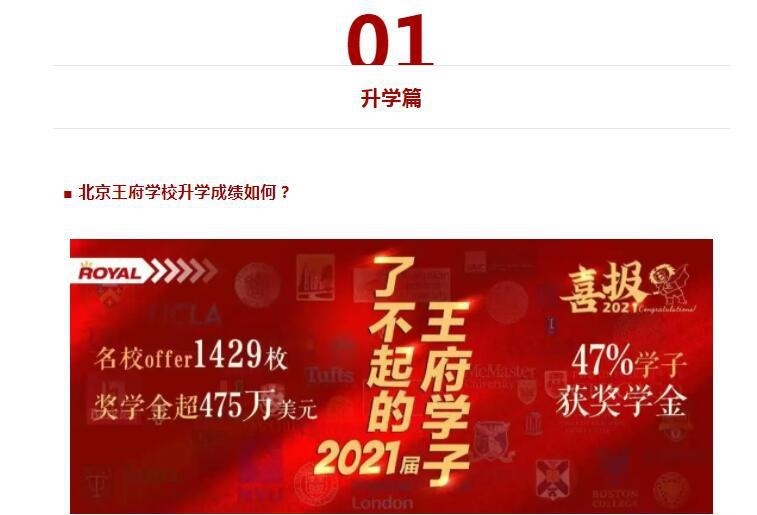 近年,北京王府学校升学表现亮眼。以2021年为例,我校美、英、加、澳、新及艺术等方向全面开花,在同类校中独具优势。王府学子共收获世界名校录取offer1429枚,奖学金总额超475万美元,获得奖学金的2021届毕业生占比人数达47%。美国方向,学子不仅摘得藤校康奈尔大学录取,还拿到了录取率低至1%的纽约大学阿布扎比分校的offer;不仅连续三年获得芝加哥大学经济学专业录取,更喜提“双黄蛋”,收获芝加哥大学offer2枚。美国TOP30名校录取比率高达36%,获得美国TOP50学校录取率64%,获得美国TOP100学校录取率100%。其他方向,录取成果已覆盖了英国G5(帝国理工学院3枚,伦敦大学学院23枚,伦敦政治经济学院1枚等)、澳洲八大(墨尔本大学13枚、悉尼大学19枚等)、加拿大Top3(麦吉尔大学1枚、多伦多大学48枚等)等世界知名大学。艺术方向,王府的音乐、视觉艺术及电影艺术等专业方向录取丰硕,收获伯克利音乐学院录取3枚、帕森斯设计学院2枚(含高额奖学金)等。北京王府学校会给孩子提供哪些升学帮助?我校设有升学指导中心,由具有海外高等教育背景、经验丰富的专业升学指导老师组成,面向全体学生提供全面的大学升学准备及申请过程指导。将“职涯规划”纳入“升学规划”,帮助确定更长久发展方向,是我校升学指导的一大特色。此外,通过升学指导课程、一对一个性化指导等,对学生的学术课程、标准化考试、背景活动提升、大学和专业选择以及大学申请实践等进行全方位细致指导。值得一提,每年众多来自于主流留学目的地国家的大学招生官和校领导到访王府,为学生提供大学学习、生活及招生的一手信息。